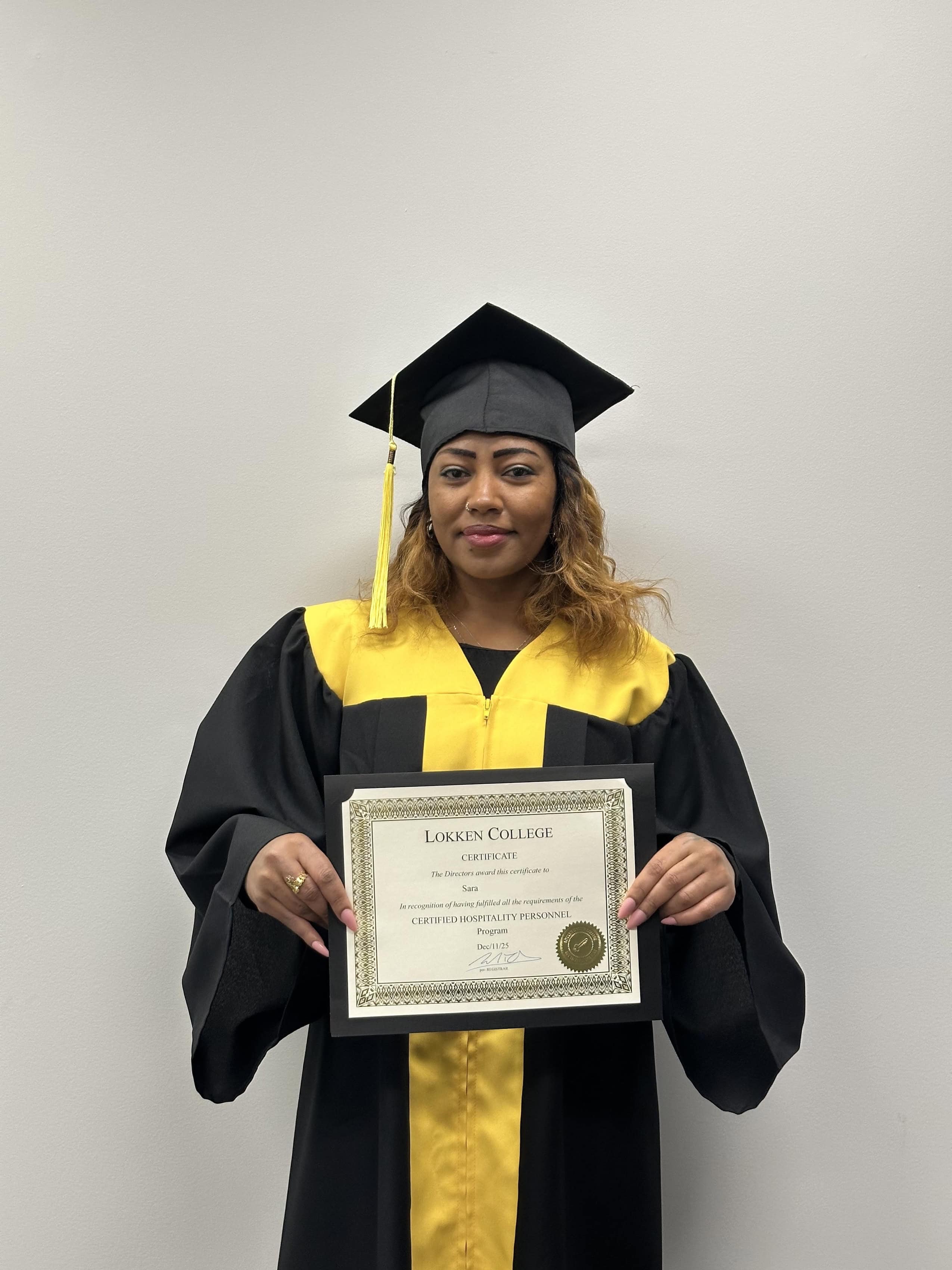 Sara recently completed Lokken College’s Certified Hospitality Personnel program, demonstrating perfect attendance and a strong commitment to her training. Her dedication throughout the program prepared her for success in the hospitality sector.